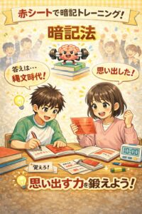 当塾の中学生用のテキスト(フォレスタシリーズ)には必ず赤シートが付いていますので、それを活用するのが一番の早道です。2ヶ月に1度実施している暗記特訓ではこの暗記法を指導していますので是非ご参加いただけると嬉しいです。